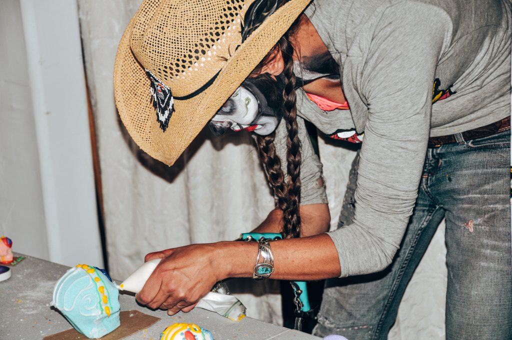 Women dressed in vibrant and intricate traditional new Mexican clothing with distinct colours and shapes, ingenuine vast feather headdresses and shell-embellished ankle cuffs that epitomized the steps the women danced. Their faces hid behind skull mask while their hands hold a drum crafting beats to dance along with. Children rejoice with their freshly painted faces conveying skulls as their eyes are the only shimmer evoking from their faces. Sugar skulls are turned into art as adults and children decorate a once one coloured sugar skull into a flourishing piece of art through the fusing of glaze consisting of boundless colours, not to be eaten by us but to be placed before the ofrenda, of the deceased.